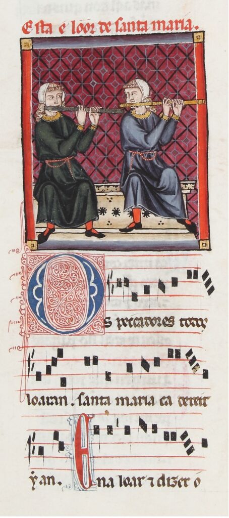 Commissioned and promoted by Alfonso X, they form one of the most important collections of Marian lyric in Galician‑Portuguese. This corpus, comprising more than four hundred cantigas, is organized into two main types: the miracle cantigas, which recount the Virgin Mary’s interventions in moments of danger or need, and the cantigas of praise, dedicated to honoring her. The work is one of the few medieval compilations that fuses poetry, music, and illumination, and its structure reveals a carefully crafted didactic and devotional purpose.